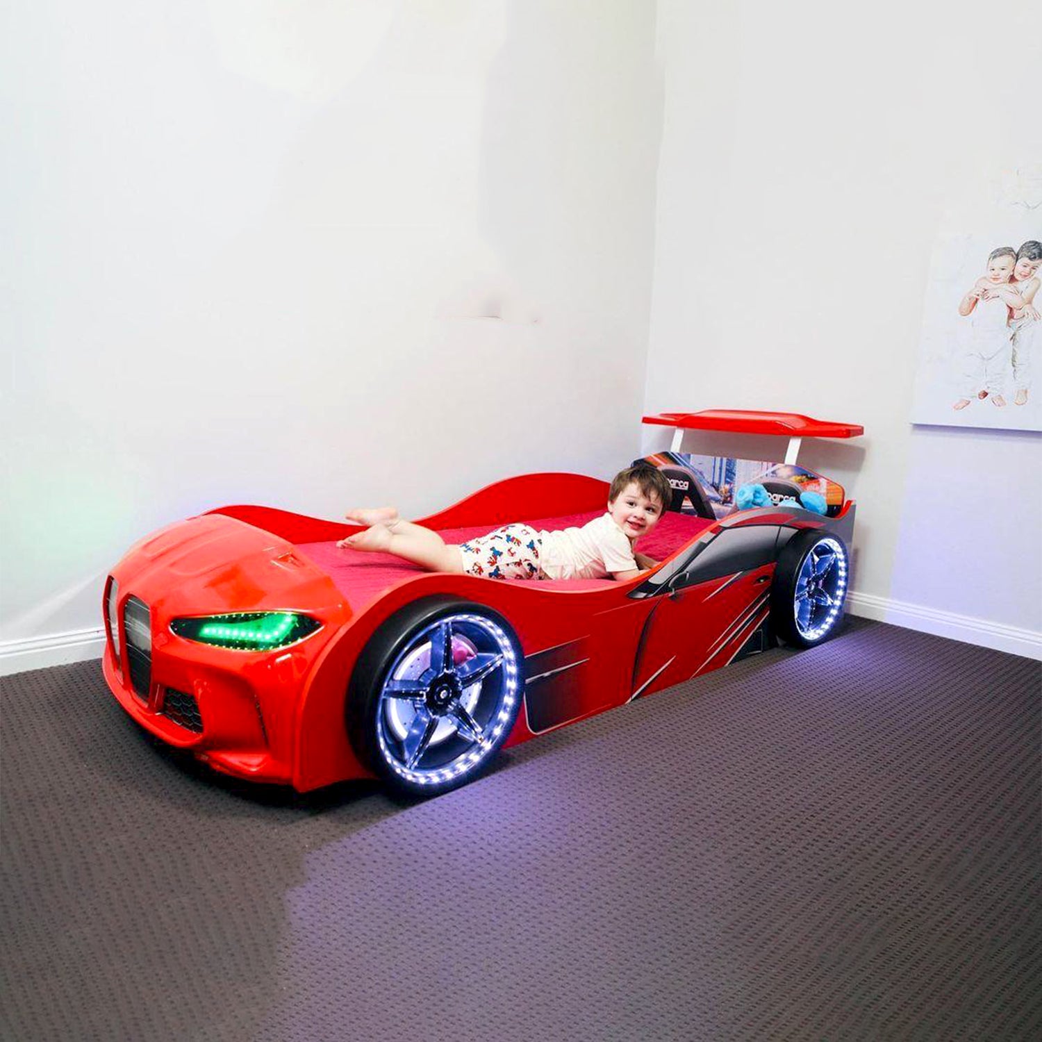 For an immersive experience, our race car bed features working LED headlights that can double as a nightlight. With a touch of a button, your child can activate realistic car engine sounds, making bedtime even more exciting!